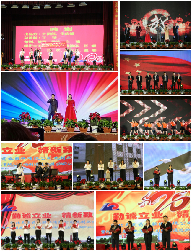 <節目名稱按圖片排列順序>1.外貿部、供應部演繹《絕代風華天成人》2.人力資源部和企管部合唱《天成人》3.渤海分公司合唱《真心英雄》4.輸液一車間舞蹈《美美噠》5.針劑一車間帶來的《走進新時代》6.固體車間小品《昨天,今天,明天》7.銷售業務部、銷售服務部帶來手語表演《感恩的心》8.道恩藥業詩朗誦《如今,我們已長大》9.銷售系統詩朗誦《改制20周年賀詞》10.生產、質量系統詩朗誦《騰飛天成》